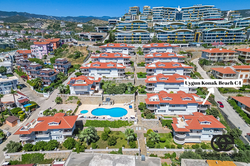 Denne penthouse-leiligheten med 3 soverom og 2 bad ligger i Uygun Konak Beach-komplekset i Konaklı-området i Alanya. Leiligheten ligger over to etasjer og tilbyr både funksjonelle oppholdsrom og hyggelige uteområder.