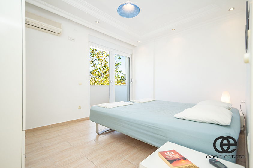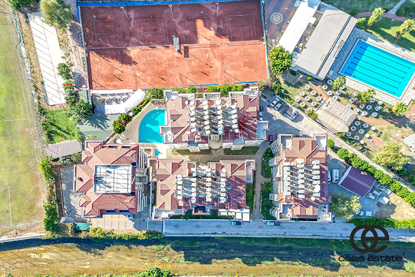 Komplekset tilbyr parkeringsplass, utendørsbasseng og vakkert vedlikeholdte hager. En elv renner rett ved siden av eiendommen, noe som bidrar til den rolige atmosfæren, mens leiligheten selv har fantastisk utsikt over havet, fjellene og den nærliggende fotballbanen. Den ligger både fredelig og sentralt.